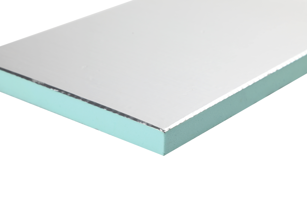 Eco-friendly insulation 52±2Kg/m3, 20.5mm thick ±0.5mm with embossed aluminum on one side and smooth, antibacterial-coated aluminum on the other.